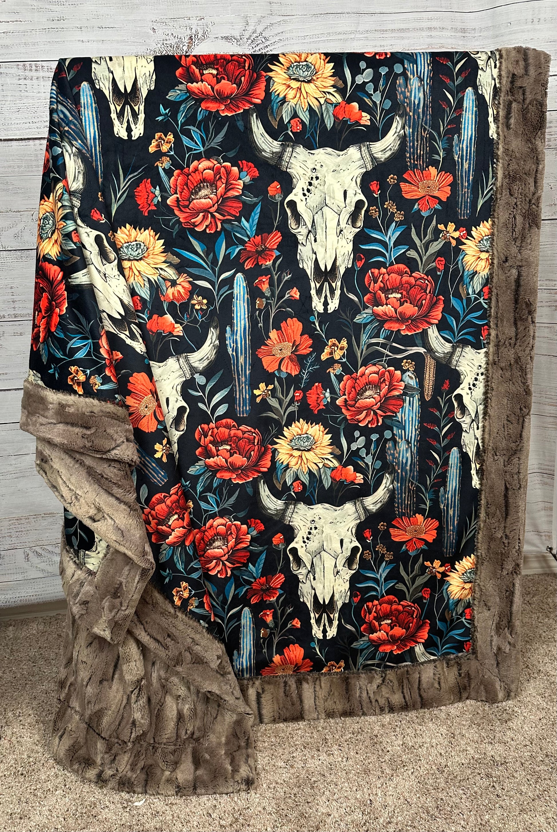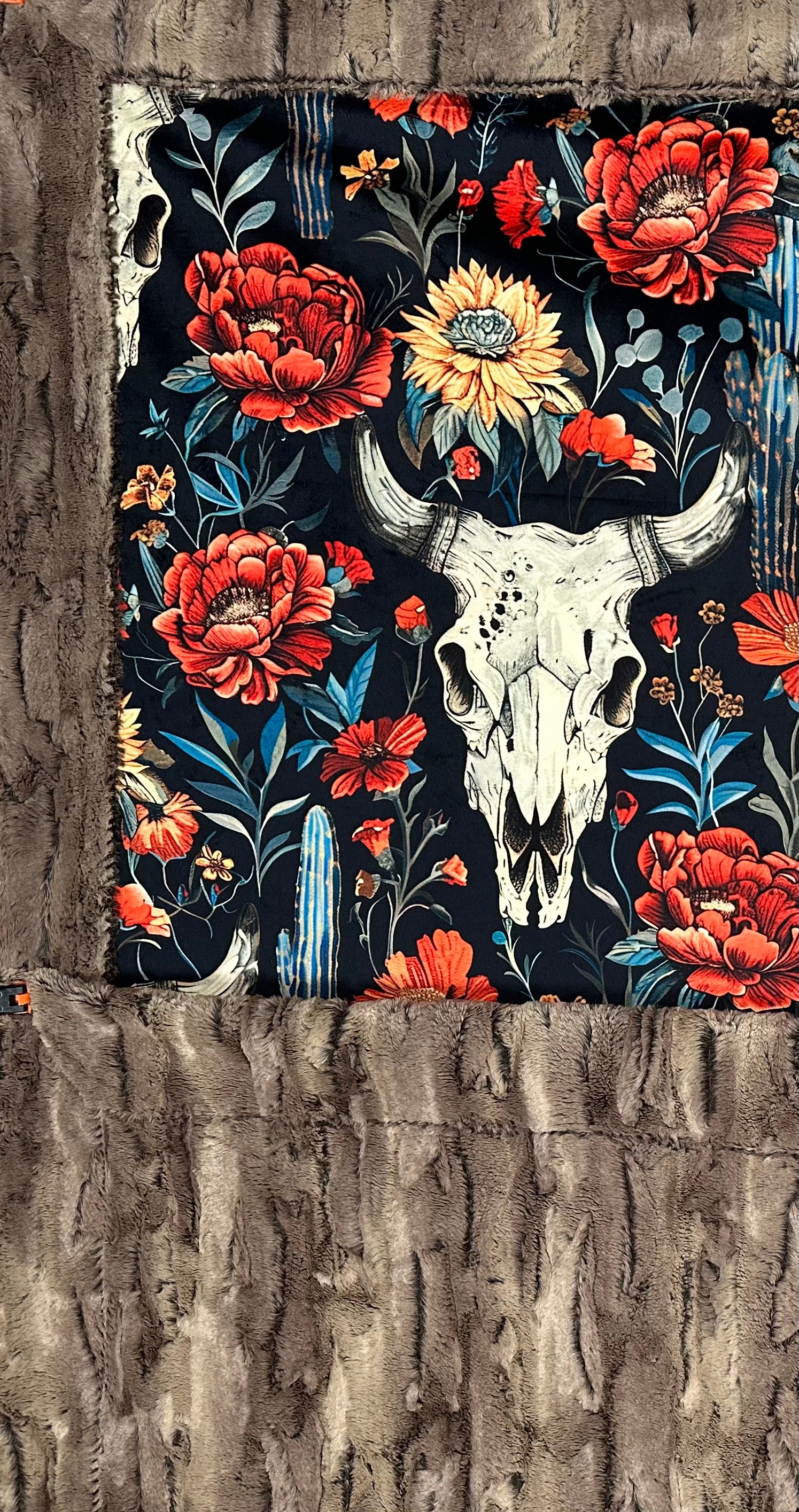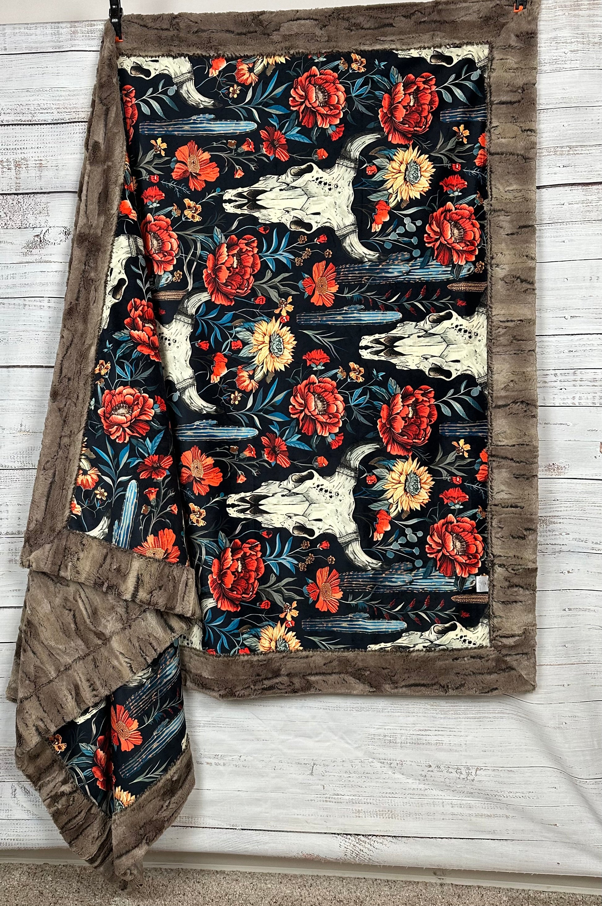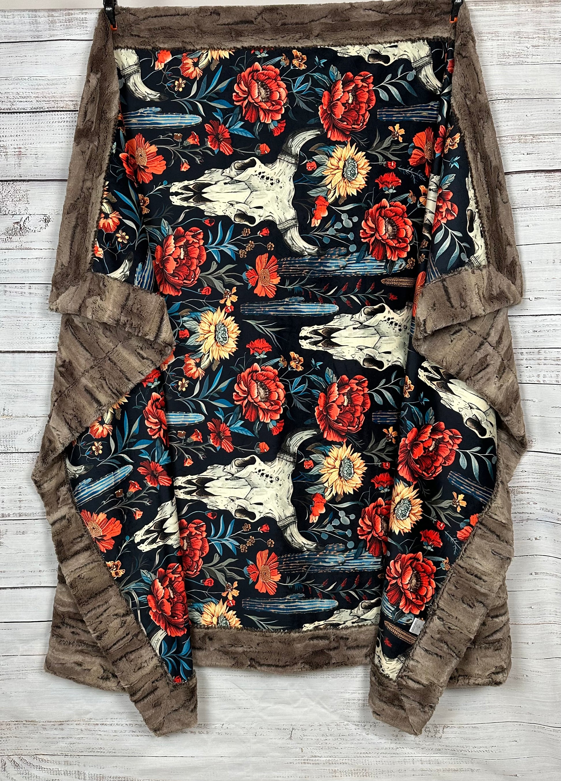 Boho Western Skull Floral on Chestnut Luxe Large 55x79 Minky Blanket