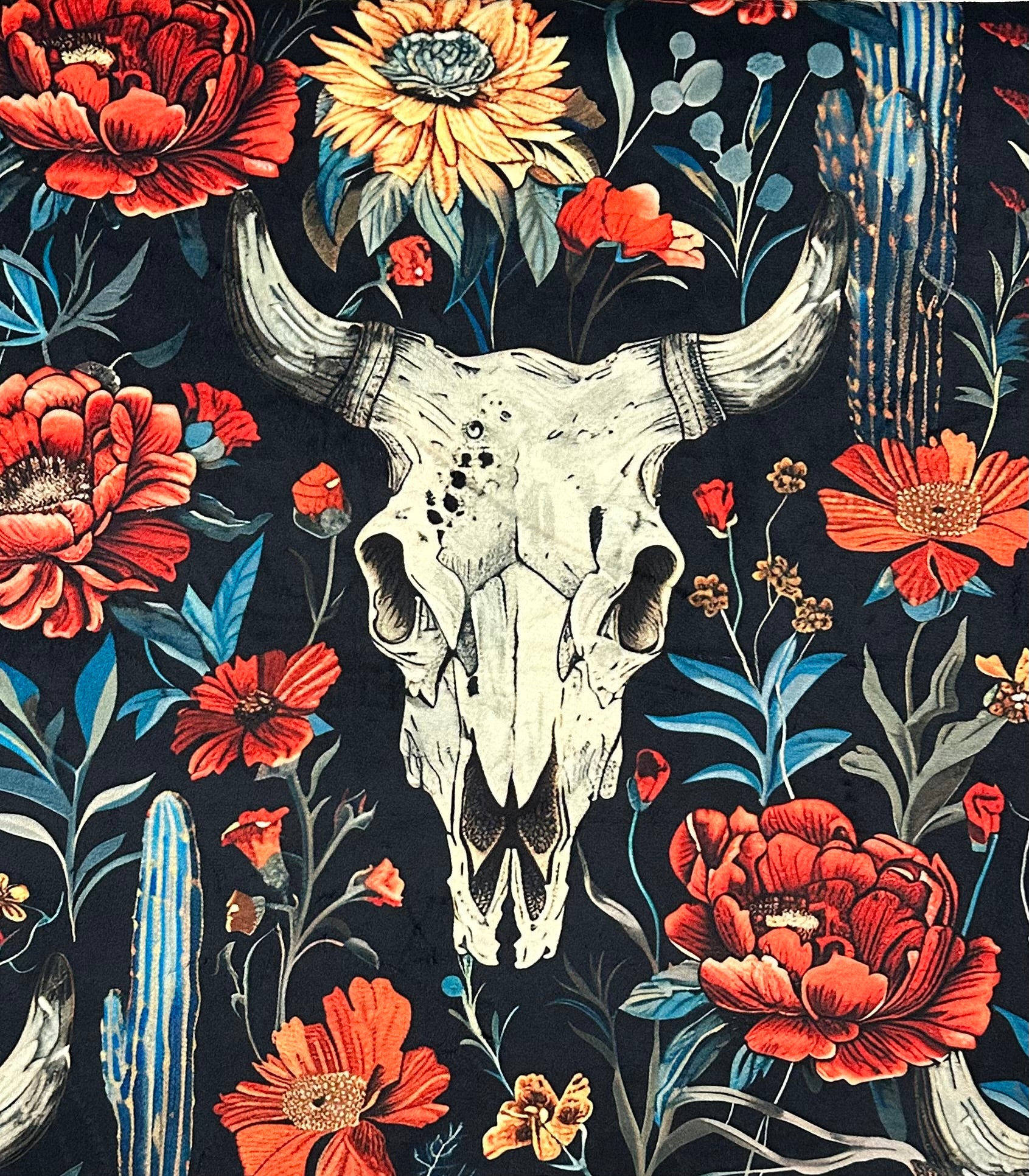 Introducing our beautiful minky blanket, a soft and comfortable addition to your home decor. The Boho Western Skull Floral design on a chestnut backing adds a unique and stylish touch to the blanket, making it a great addition to any home decor. The southwestern decor style is known for it's earthy tones and rustic charm, and this blanket is no exception. Our minky blanket is not only beautiful but also handcrafted with outmost care and attention to detail, making it a one-of-a-kind item that can be a unique gift for someone special.