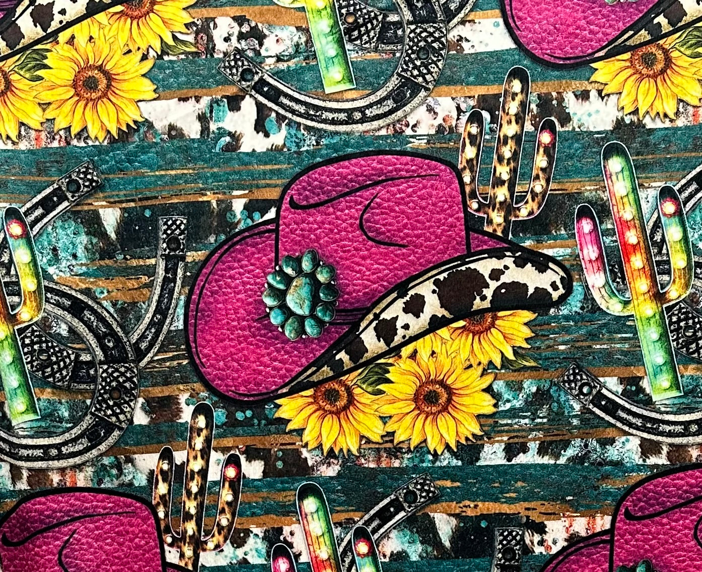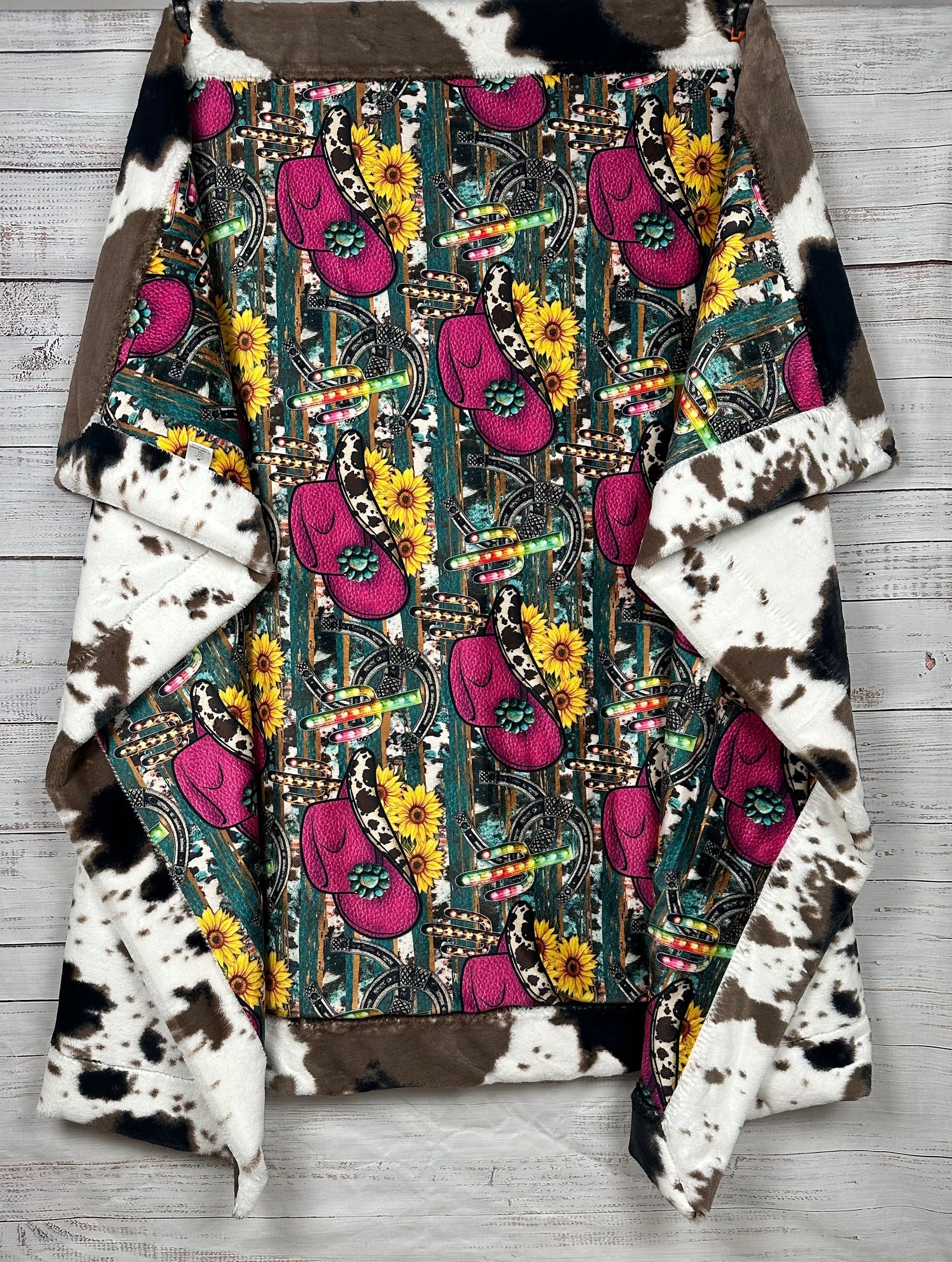 Cowgirl Pink Hat with Sunflower Cowhide on Pony Mudpie Luxe Large 55x79 Minky Blanket